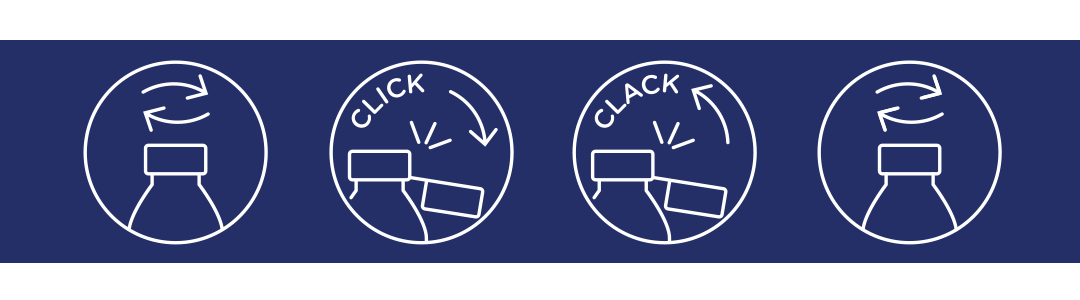 1. Abrir hasta accionar el click para que el tapón quede completamente abierto y no moleste ni al beber ni al servir