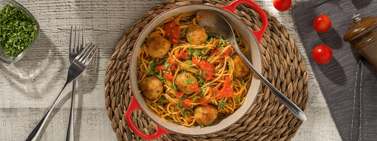5 Hervir la pasta en abundante agua según las instrucciones del paquete. Servir la pasta integral con las albóndigas y la salsa de tomate por encima.