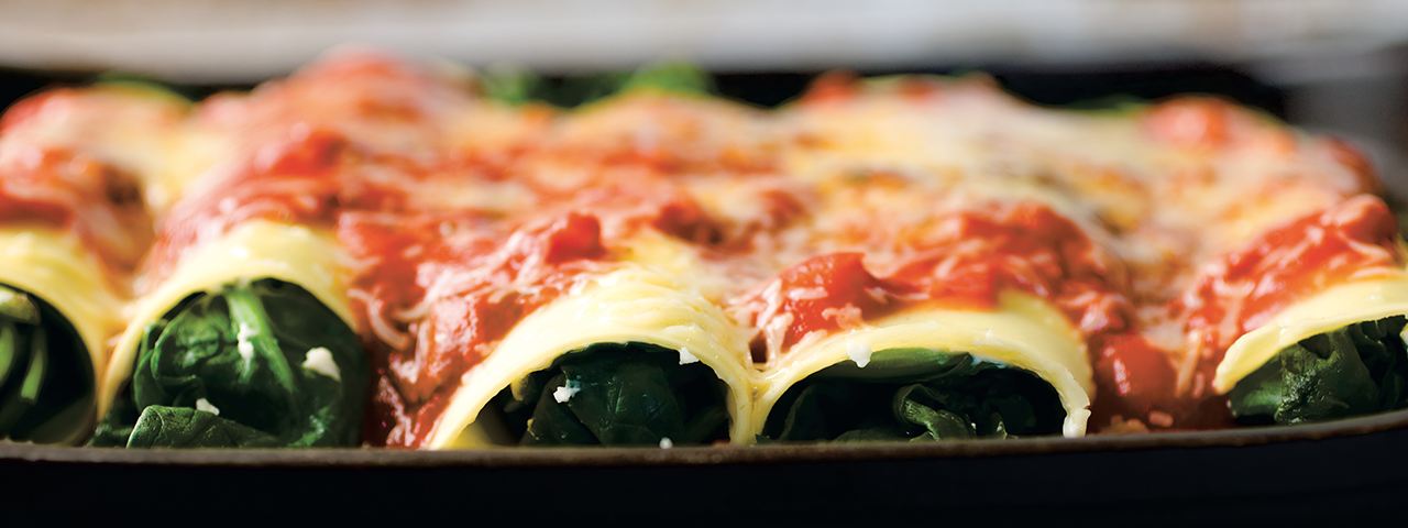 8 Vierte la salsa de tomate sobre los canelones, corónalos con queso rallado y cocínalos en el horno previamente calentado a 200ºC durante 20 minutos.