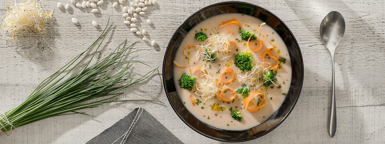 3 Emplatar sirviendo la crema de alubias en la base de un plato y disponer los brotes de brócoli por encima y las láminas de zanahoria.