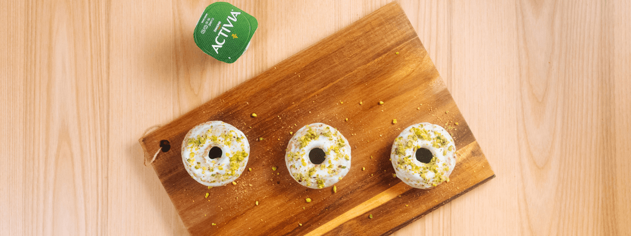 2 Mientras se hornea puedes preparar la cobertura. Para hacerlo, bate el Activia hasta que quede con una textura líquida. Una vez salga la masa del horno, pon la cobertura encima de cada donaked y finalmente añade un toque de canela en la superficie.