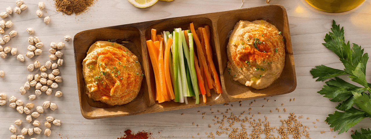 5 Servir el hummus con el pimentón dulce por encima junto con un hilo de aceite de oliva virgen. Acompañar con las verduras.