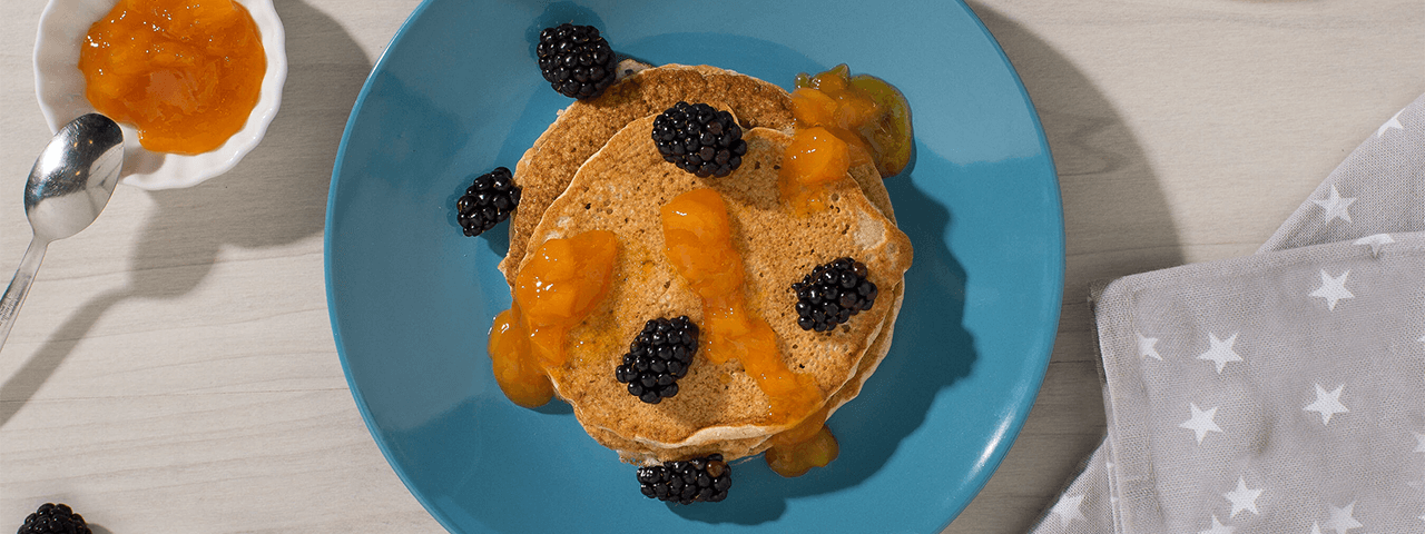 4 Poner a calentar una sartén antiadherente con unas gotas de aceite de oliva, añadir tres cucharadas de la masa y cocer a fuego bajo. Cuando empiece a burbujear darle la vuelta hasta que esté cocido. Repetir esta operación hasta obtener los pancakes deseados.
