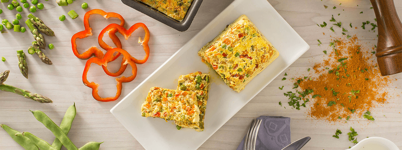 3 Mezclar las claras de huevo con la leche desnatada, nuez moscada y perejil picado. Salpimentar y agregar las verduras.