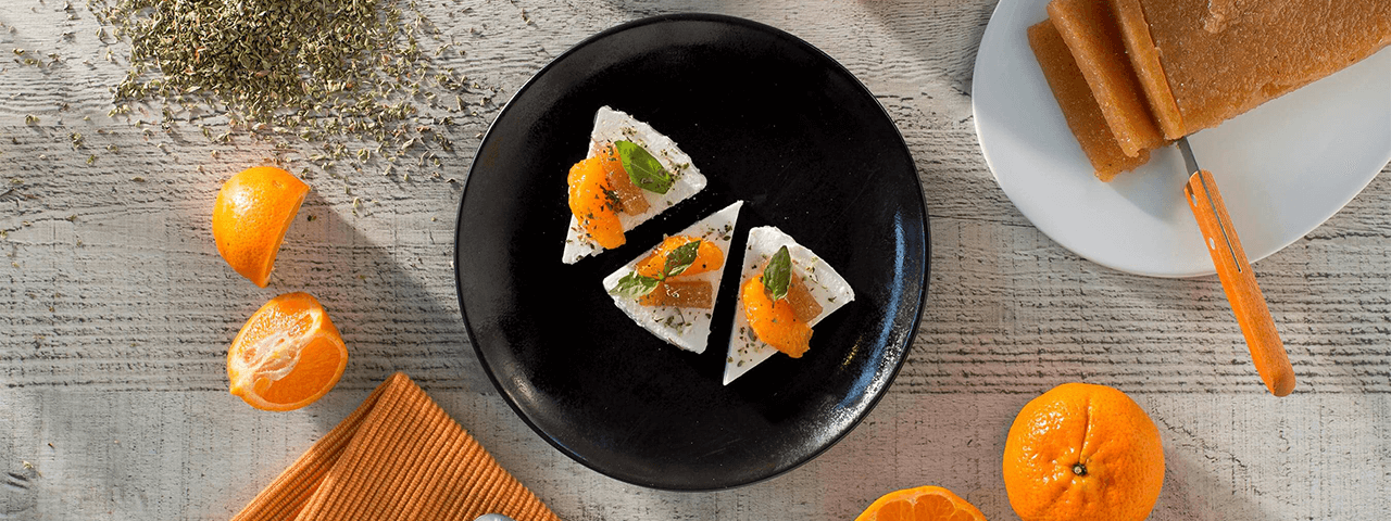 4 Disponer los rectángulos de membrillo y los gajos de naranja intercalados encima de cada rodaja de queso fresco.