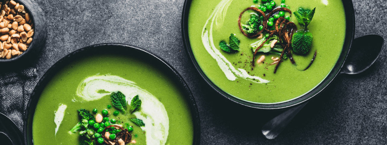 1 Colocamos todos los ingredientes (excepto las hojas de menta, el pepino y lo rábanos) en una batidora de vaso y batimos hasta conseguir una suave y aterciopelada crema.