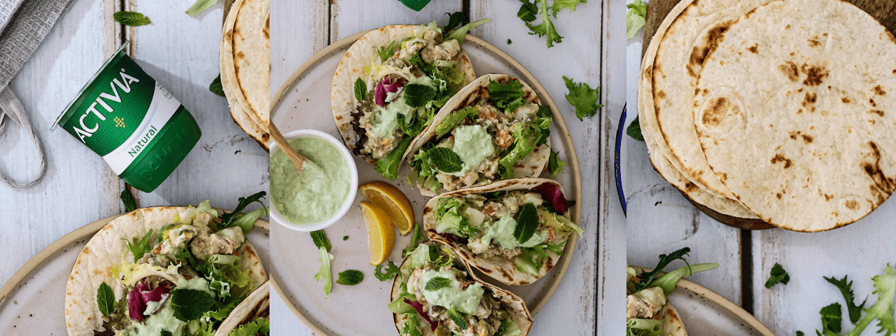 Tacos de ensaladilla con salsa de Activia y aguacate