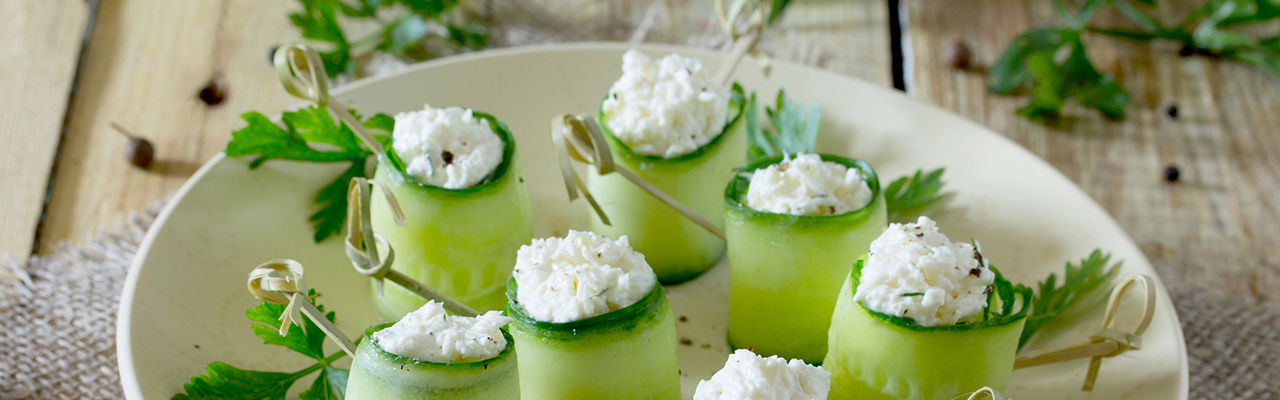 4 Depositar una cucharada del relleno de yogur preparado en cada una de las rodajas de pepino y enrolla las tiras.