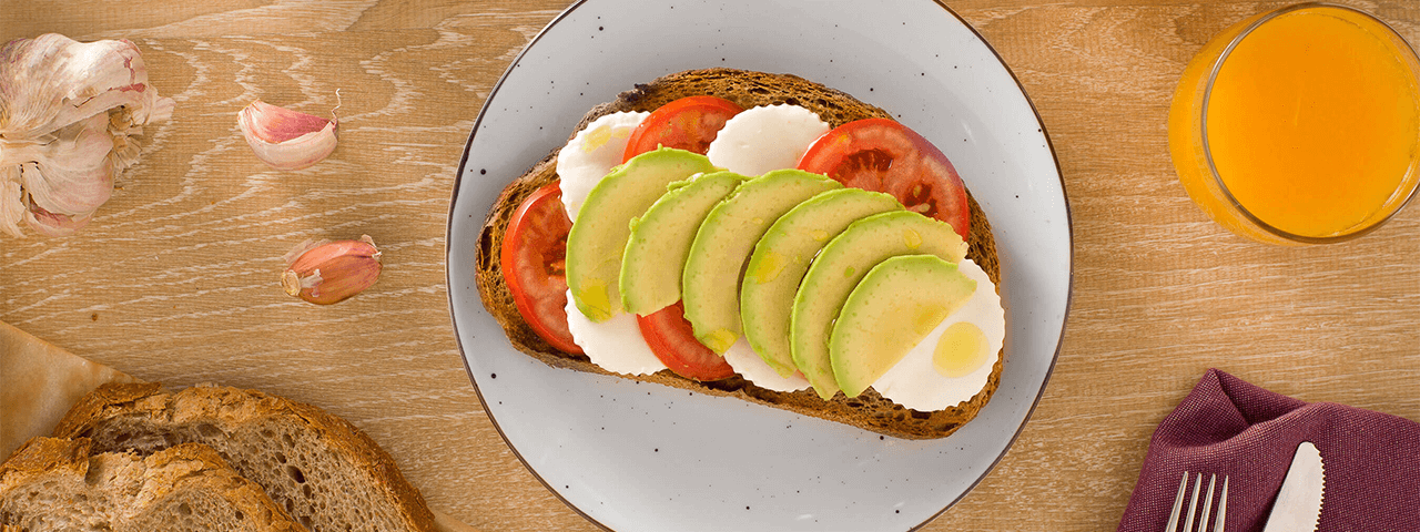 Tostadas con tomate, aguacate, queso fresco y zumo de naranja